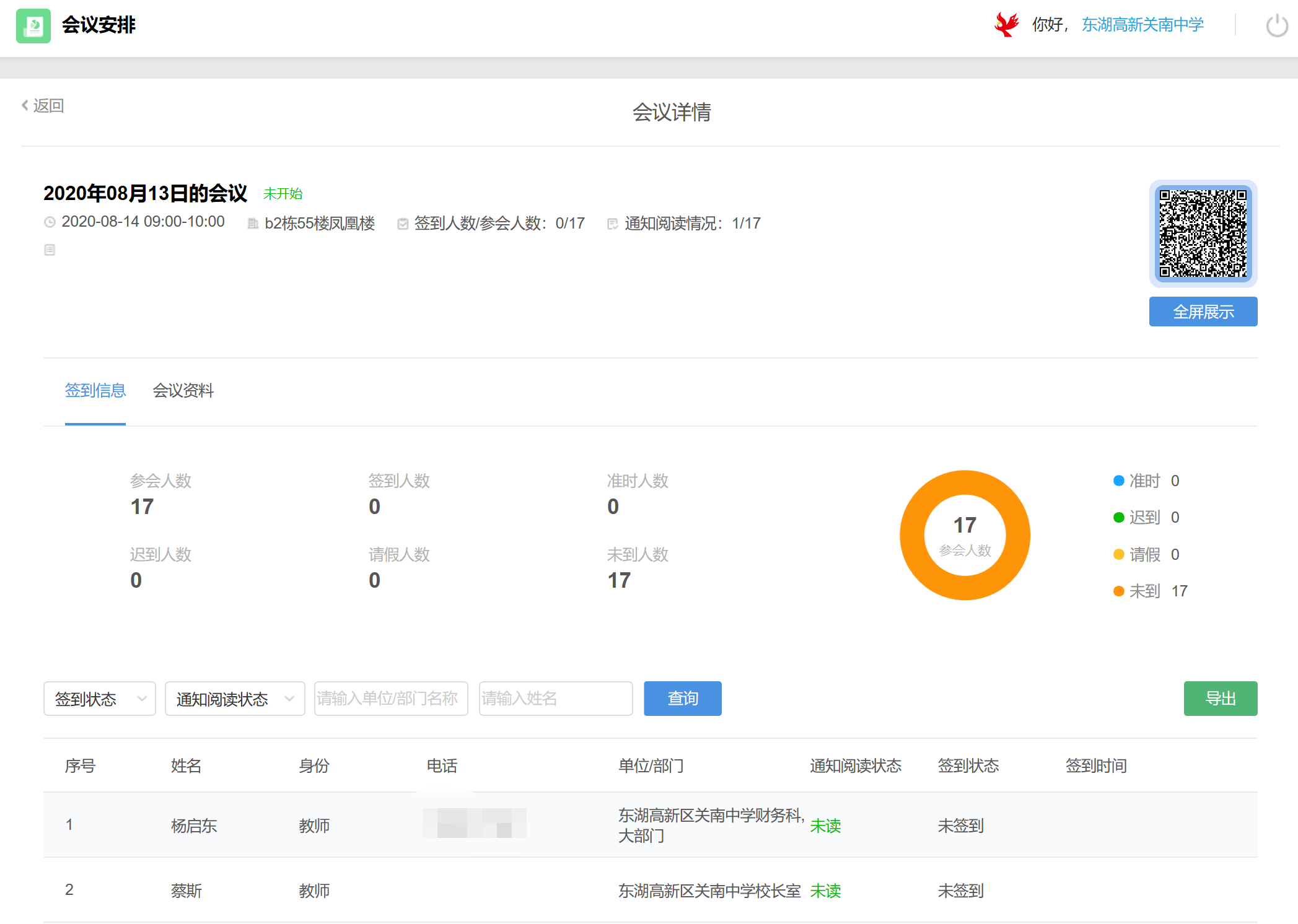 会议安排模块可实现学校会议发起、签到的管理,对会议提醒、会议资料、会议考勤、会议纪要整个过程的内容形成一个追踪。教师可以通过web端与手机端发起会议,上传会议资料,邀请参会人员;支持教师利用手机扫码签到,系统统计已签到人员与未签到人员。额外支持手动登记的方式,便于校外未注册用户签到。